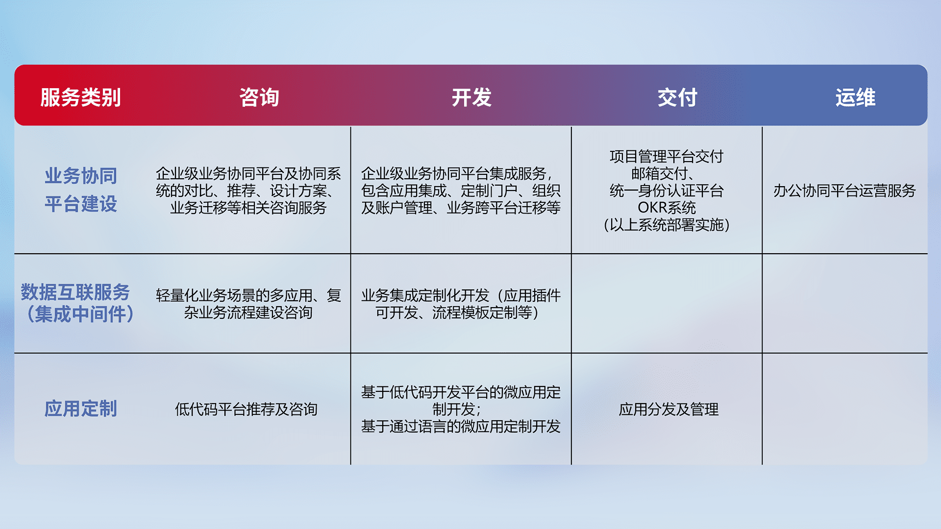 针对钉钉、、企微、、、IDaas等平台级产品提供产品的规划、、方案、、交付、、、、定制化开发等服务,,,实现如统一协同办公、、、智能客户服务、、混合会议管理、、、、智能数据查询、、、等业务场景,,实现数字化转型。。。。